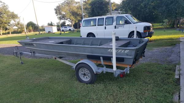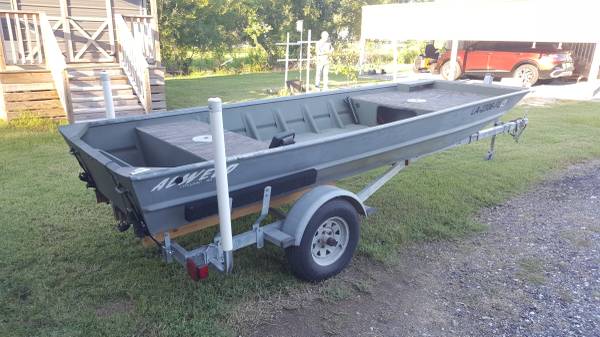 2005 Alweld 1442 LA Series Aluminum Boat and Trailer. Rated for 25 HP short shaft.