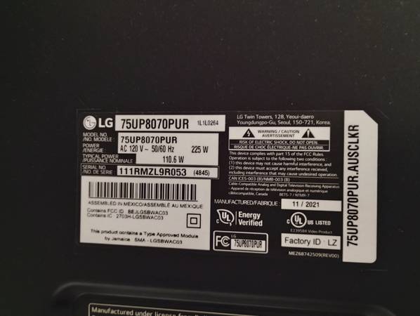 LG 75" appx 53" x 38" Model 75UP8070PUR Wifi capable with Think Q Remote included. Feet included. Wall mount included. Mnfg. Date 11/2021. Not used much. Works perfect. Excellent condition. First...
