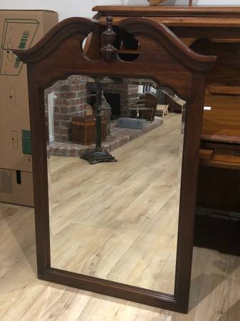 Solid cherry wood mirror. Perfect condition with no scratches or nicks. Was part of a dresser. Has flat bottom to be placed on top of a dresser. Or can be used to hang on the wall. Measures 31" wide...