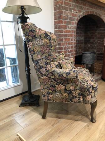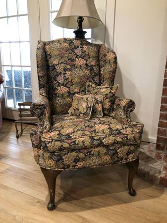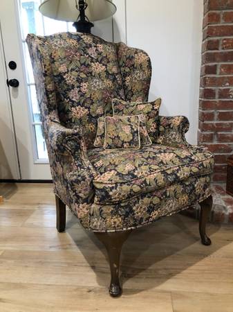 Beautiful Wingback chair. Extremely solid and well made. No tears or stains in the fabric. Includes 4 small matching pillows. Pickup in Ragley.