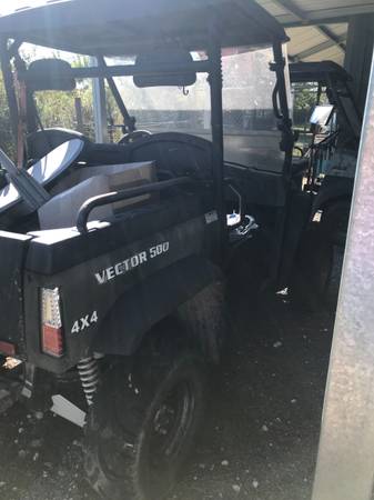 I have a Vector 500 I would like to sell. It runs great, never had any problem with motor. It does not burn oil, is economical on gas. I have, however, had problems with the system that changes the gears ( from forward to reverse), right now it is in forward and can't change it to reverse. Fairly easy to fix, but I am in my 70's and can't do it. Just recently the left front CV joint broke (so I am told) so the front tire wobbles as it turns! The only other thing it could use is a new seat cushion. It is however, usable as is. It has a new Plexiglass windshield installed in the spring. It has a working wench on the front.
