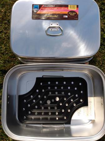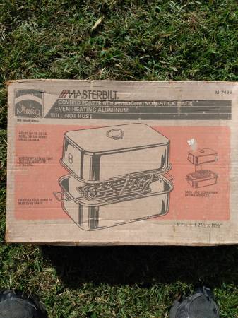 Brand new, in box 17-1/4" x 12-1/2" x 8-1/2" covered aluminum roaster. Mirro Masterbilt model M-7496.