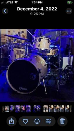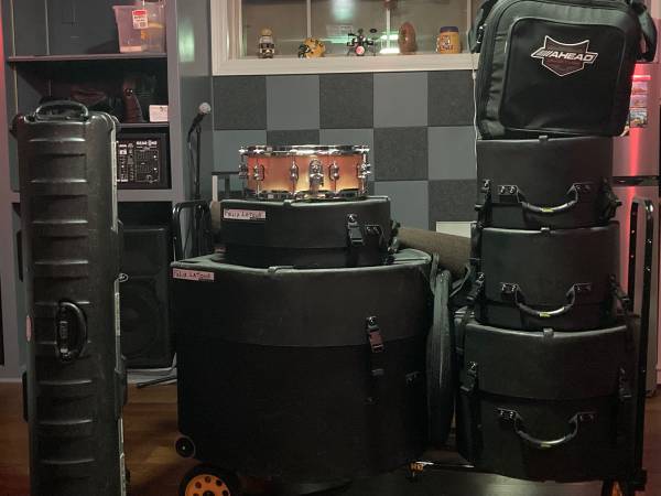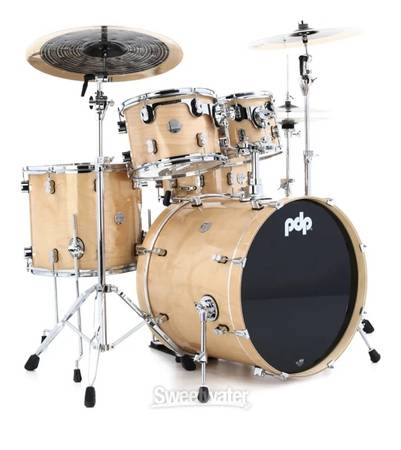 Great 5 PCs PDP drum kit made by DW , Evans drum heads. All accessories , maple wood shells, double bass drum pedal, hard shell drum cases for all drums, slew of variety quality cymbals (rides, crashes, hit hats) and one Gretch snare drum. Vertical rolling trap case for all stands.
