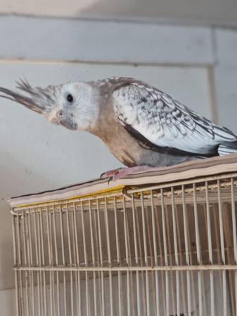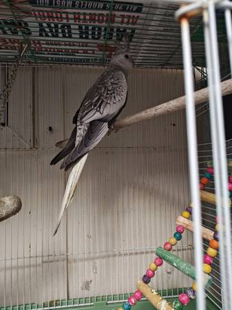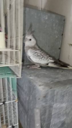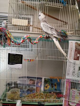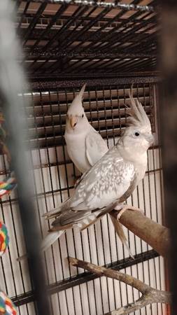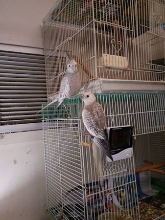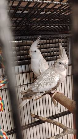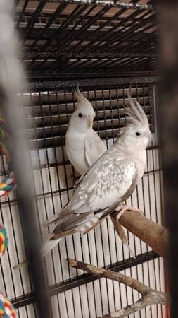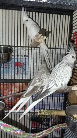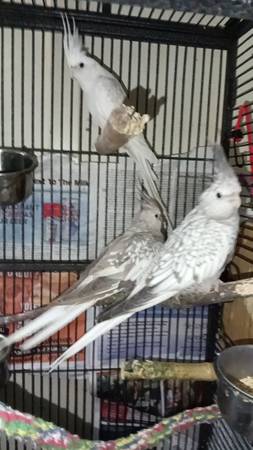One female one male and one younger sex not known WhiteFace Pearl cockatiels up for discussion Rehoming fee applies text prefer Marcus -