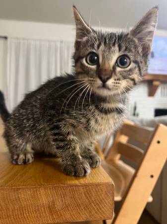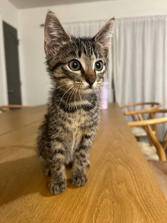 She’s about 8–9 weeks old (my best guess). She’s very sweet, cuddly, and loves attention. She’s still a little nervous around other cats and dogs but is good with kids. She’s already had a bath to get rid of fleas and is much more comfortable now.