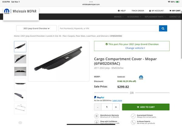 Like new cargo cover for a 2021 Jeep Grand Cherokee Laredo X. Amazing condition out of a clean, no smoking vehicle. I paid $395 for it when I bought my Grand Cherokee new in 2020. Asking $60. I traded it for a new Grand Cherokee and took it out thinking it would fit my new one and it does not.